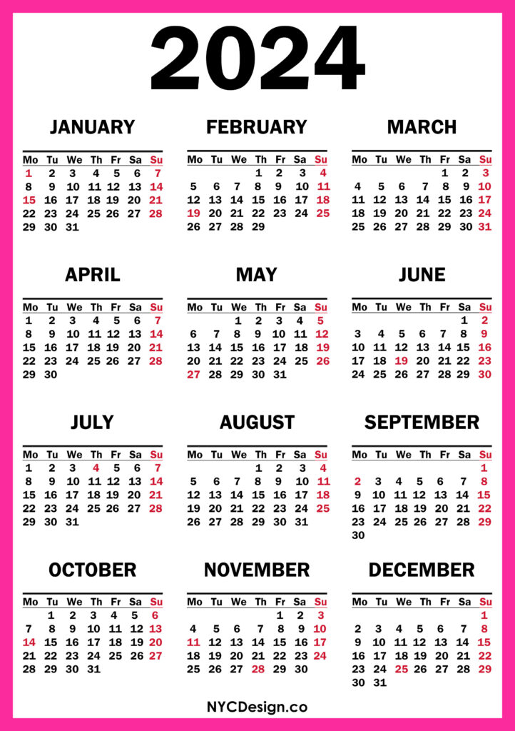 2024 Calendars• Calendars• Calendars with Holidays• Monday Start• United States 2024 Calendar with US Holidays, Printable Free, Pink – Monday Start 2021-11-222022-08-04