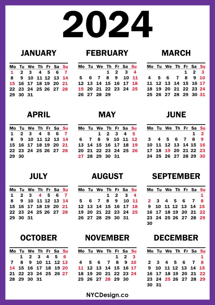 2024 Calendars• Calendars• Calendars with Holidays• Monday Start• United States 2024 Calendar with US Holidays, Printable Free, Purple – Monday Start 2021-11-222022-08-04
