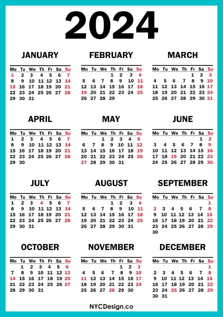 2024 Calendars• Calendars• Calendars with Holidays• Monday Start• United States 2024 Calendar with US Holidays, Printable Free, Turquoise Blue – Monday Start 2021-11-222022-08-04