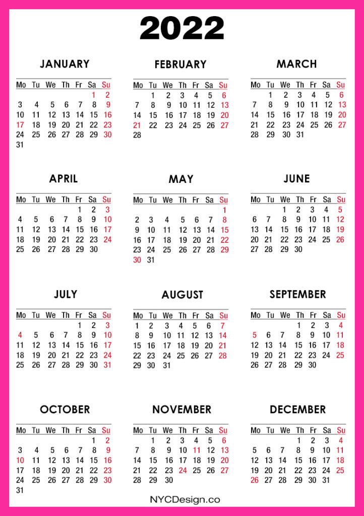 2022 Calendars• Calendars• Calendars with Holidays• Monday Start• United States 2022 Calendar with US Holidays, Printable Free, Pink – Monday Start 2020-09-122022-08-04