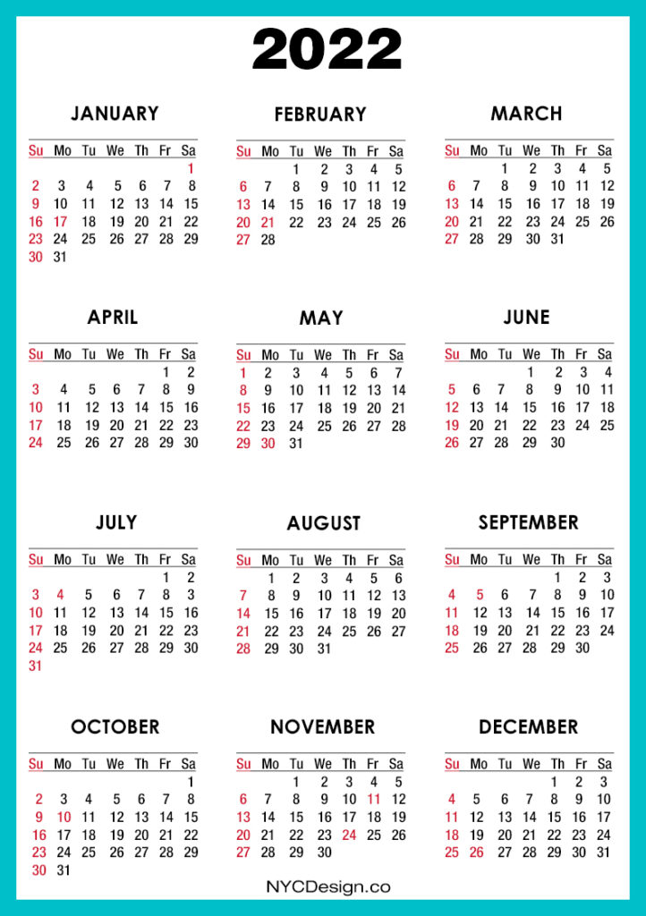2022 Calendars• Calendars• Calendars with Holidays• Sunday Start• United States 2022 Calendar with US Holidays, Printable Free, Turquoise – Sunday Start 2020-09-132022-08-04