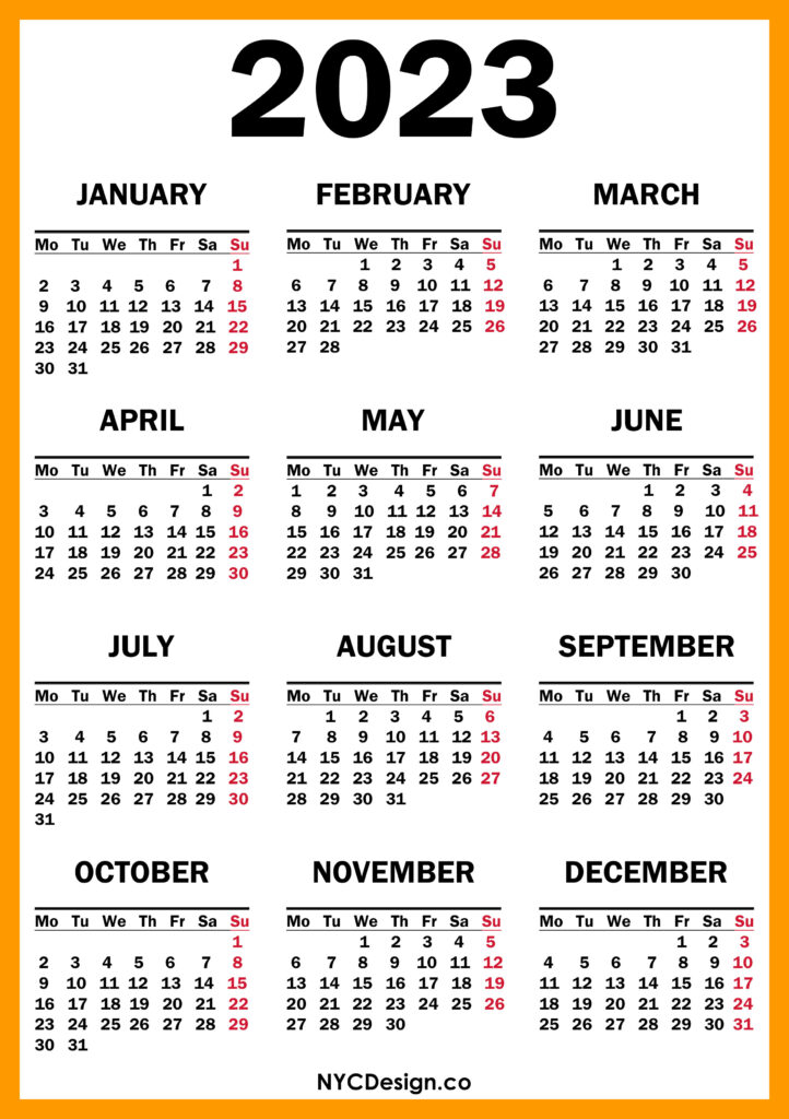 2023 Calendars• Calendars• Monday Start• Printable Calendars 2023 Calendar Printable Free, Orange – Monday Start 2021-11-042022-08-04