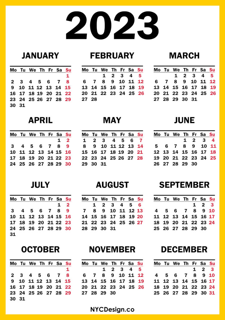 2023 Calendars• Calendars• Monday Start• Printable Calendars 2023 Calendar Printable Free, Yellow – Monday Start 2021-11-042022-08-04