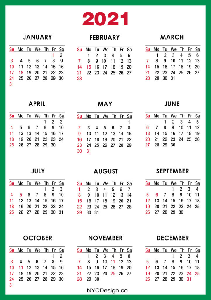 2021 Calendars• Calendars• Printable Calendars• Sunday Start 2021 Calendar with US Holidays, Printable Free, Green – Sunday Start 2020-03-012022-08-04
