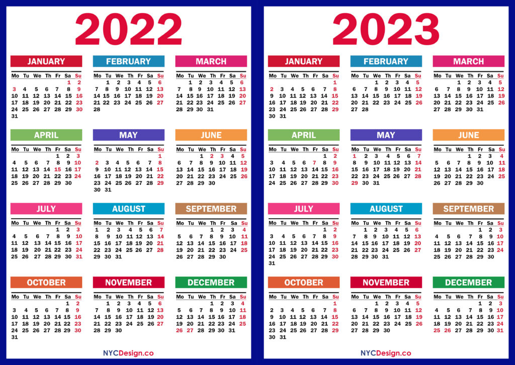 Calendars• Monday Start• Two Year Calendars 2022 – 2023 Two Year Calendar with UK Holidays, Printable Free, Colorful 2021-11-062022-08-04