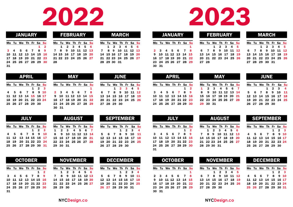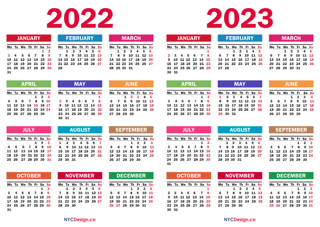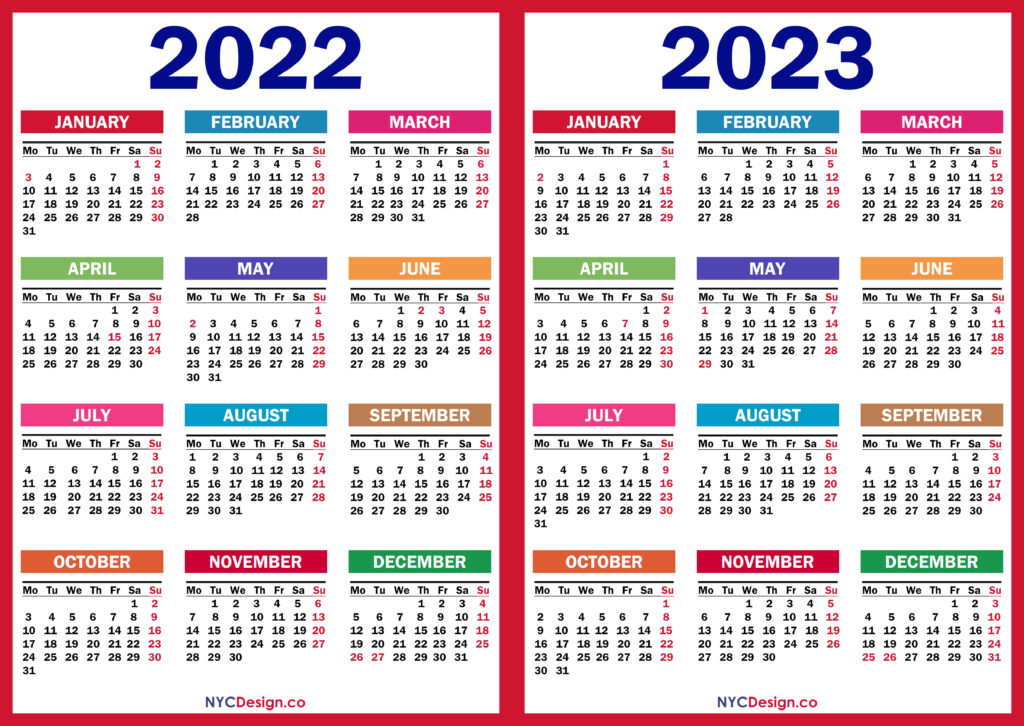 Calendars• Monday Start• Two Year Calendars 2022 – 2023 Two Year Calendar with UK Holidays, Printable Free, Colorful, White, Red, Black 2021-11-062022-08-04