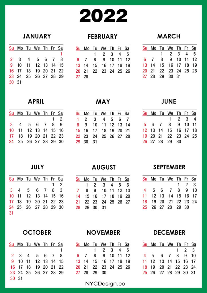 2022 Calendars• Calendars• Sunday Start• Yearly Calendars 2022 Calendar Printable Free, Green – Sunday Start 2020-09-132022-08-04