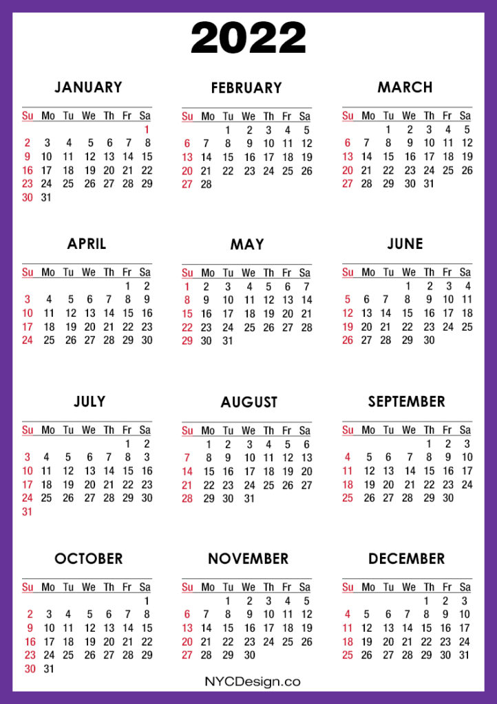 2022 Calendars• Calendars• Sunday Start• Yearly Calendars 2022 Calendar Printable Free, Purple – Sunday Start 2020-09-132022-08-04