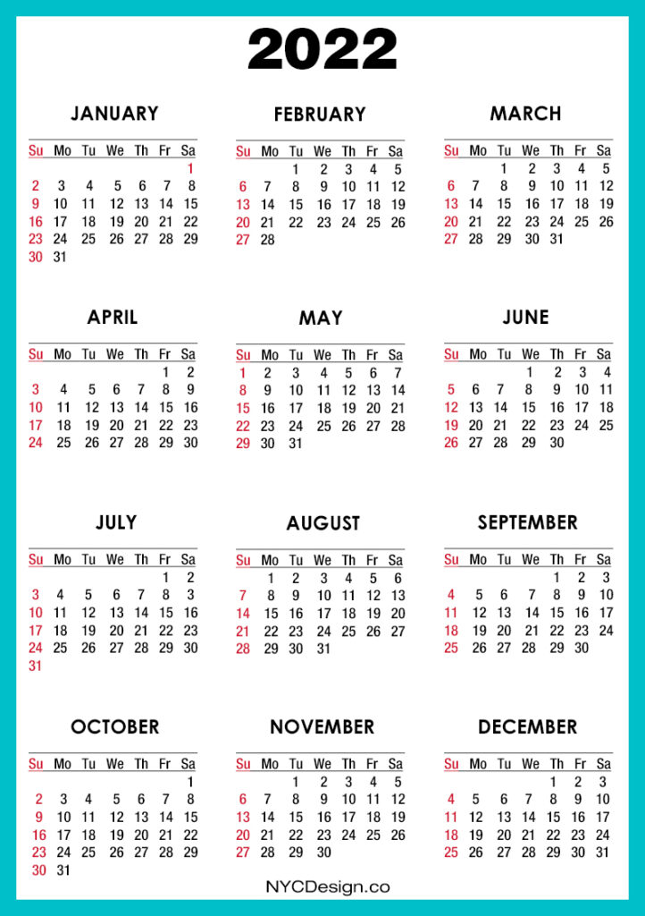 2022 Calendars• Calendars• Sunday Start• Yearly Calendars 2022 Calendar Printable Free, Turquoise – Sunday Start 2020-09-132022-08-04