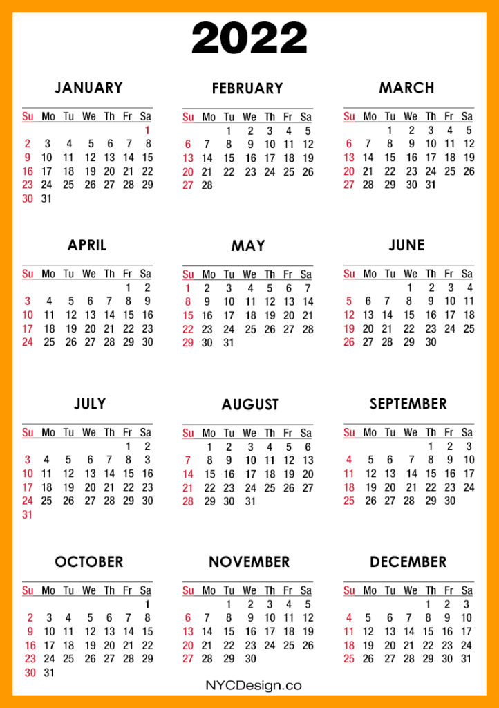 2022 Calendars• Calendars• Sunday Start• Yearly Calendars 2022 Calendar Printable Free, Orange, Yellow – Sunday Start 2020-09-132022-08-04