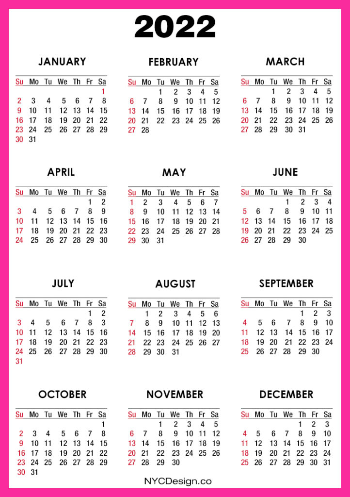 2022 Calendars• Calendars• Sunday Start• Yearly Calendars 2022 Calendar Printable Free, Pink – Sunday Start 2020-09-132022-08-04