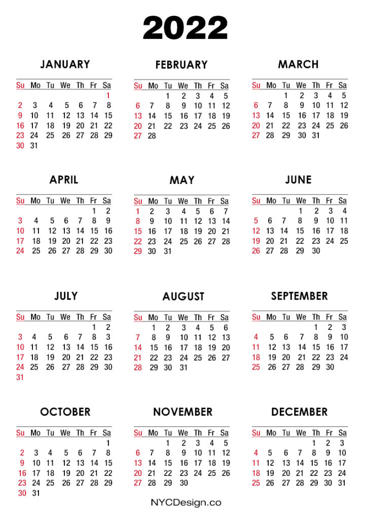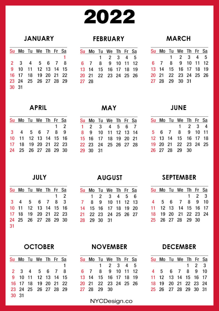 2022 Calendars• Calendars• Sunday Start• Yearly Calendars 2022 Calendar Printable Free, Red – Sunday Start 2020-09-132022-08-04