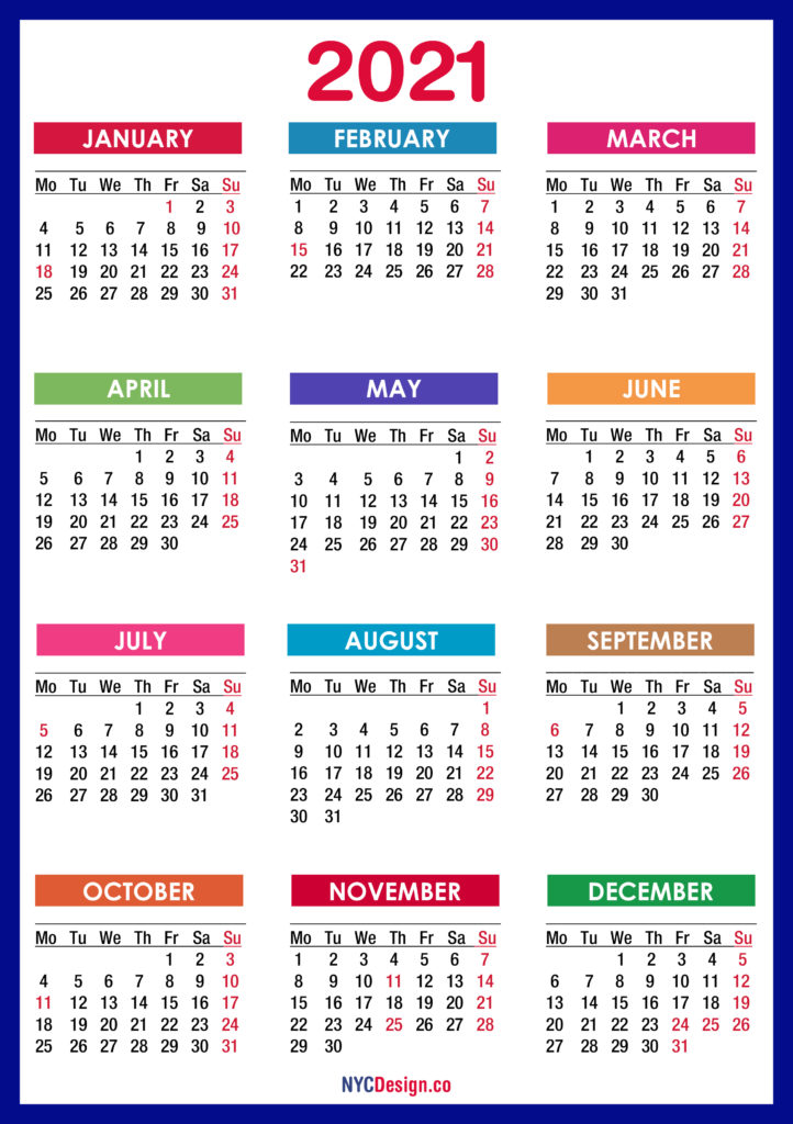 2021 Calendars• Calendars• Monday Start• Printable Calendars 2021 Calendar with Holidays, Printable Free, PDF, Colorful – Monday Start 2019-11-112022-08-04