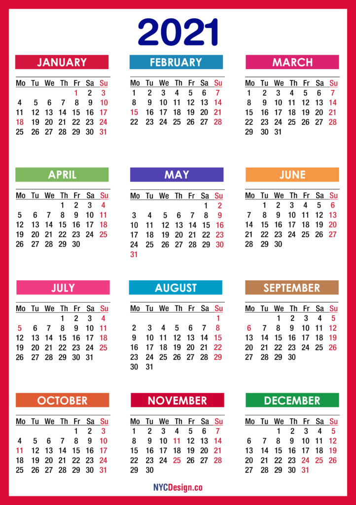 2021 Calendars• Calendars• Monday Start• Printable Calendars 2021 Calendar with Holidays, Printable Free, PDF, Colorful, Red, Orange – Monday Start 2019-11-112022-08-04