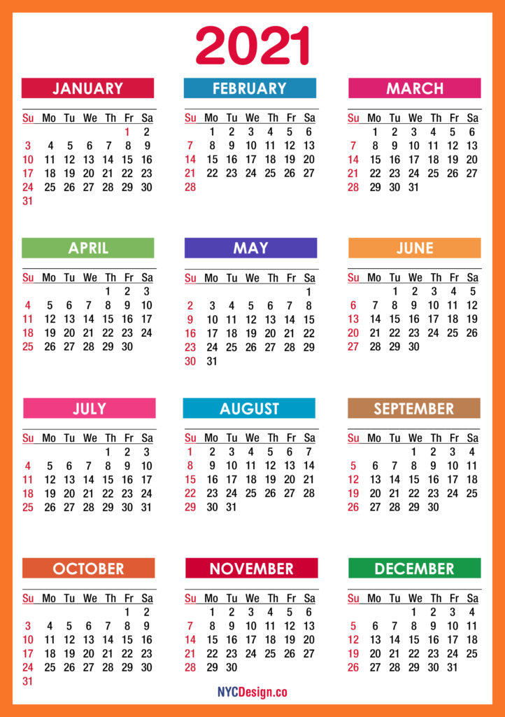 2021 Calendars• Calendars• Printable Calendars• Sunday Start 2021 Calendar Printable Free, PDF, Colorful, Red, Orange – Sunday Start 2019-11-112022-08-04
